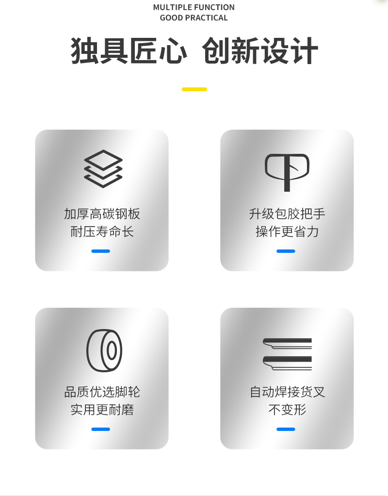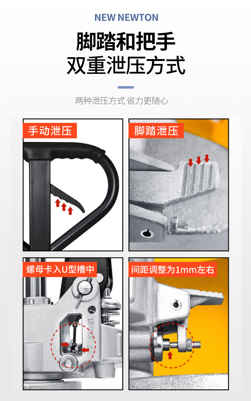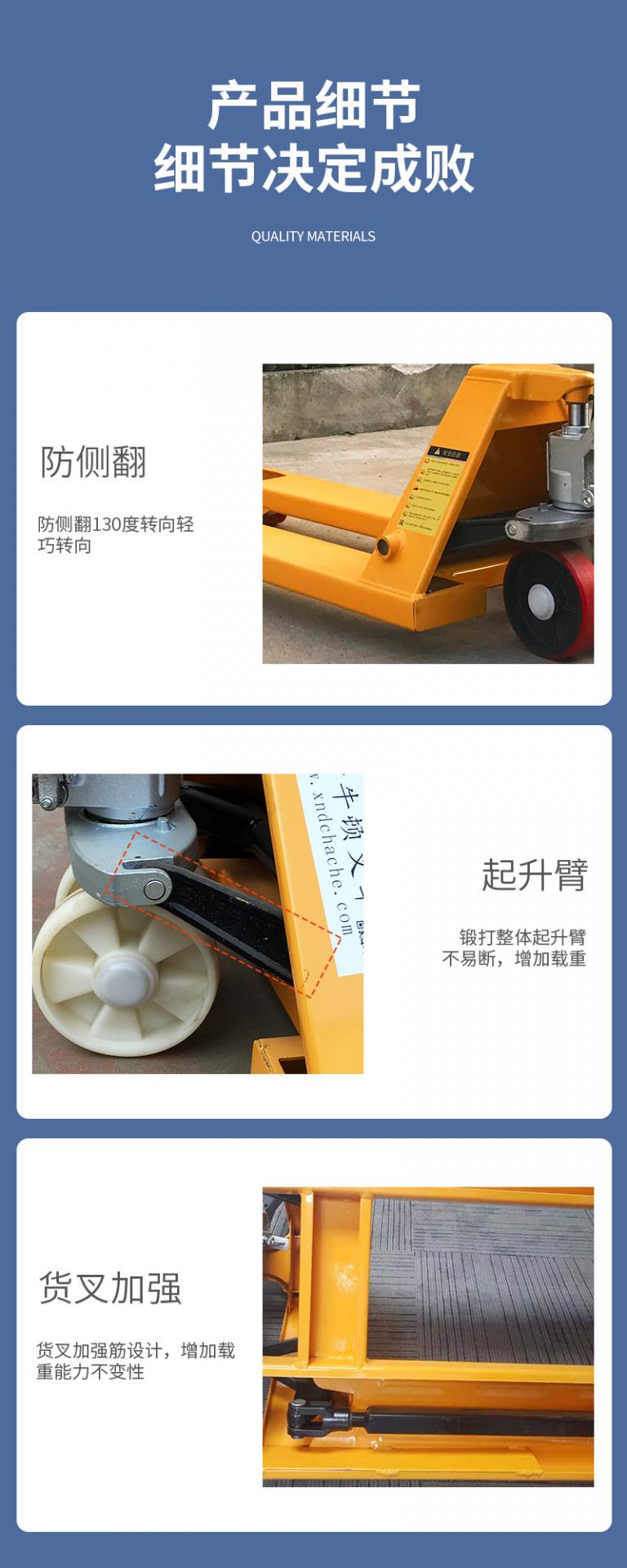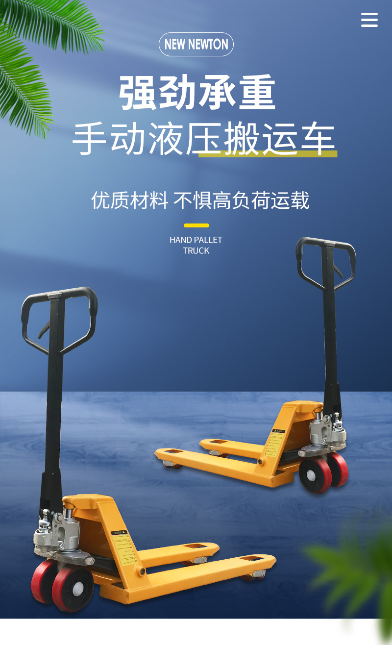 手動托盤搬運車主要包括:2噸2.5噸3噸手動托盤搬運車?手動叉車用什么托盤:川字或九腿的單面托盤,不可以用雙面托盤。手動托盤叉車噴塑表面,油漆更光亮更耐用美觀;手動托盤叉車輪子可定制為尼龍和鐵心聚氨酯輪胎;手動托盤叉車機械手臂焊接的接縫更牢固,使用壽命長;手動托盤叉車小幅度內傾角設計,防止貨物傾斜,提高工作效率。
